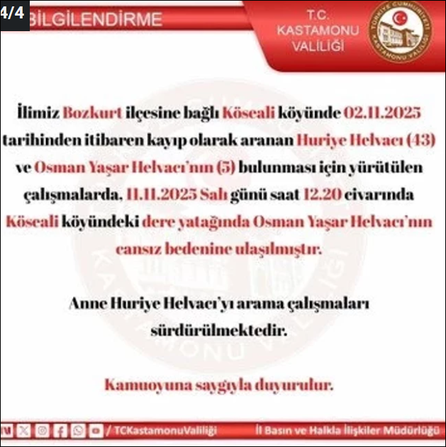 Jandarma Arama Kurtarma (JAK) ve AFAD ekipleri bölgedeki akarsularda arama çalışmasını sürdürürken 5 yaşındaki kayıp Osman'dan acı haber geldi. Kastamonu Valiliği yaptığı açıklamada 5 yaşındaki çocuğun cansız bedeninin Kösali köyündeki dere yatağında bulunduğunu bildirdi. Valiliğin açıklaması şöyle: