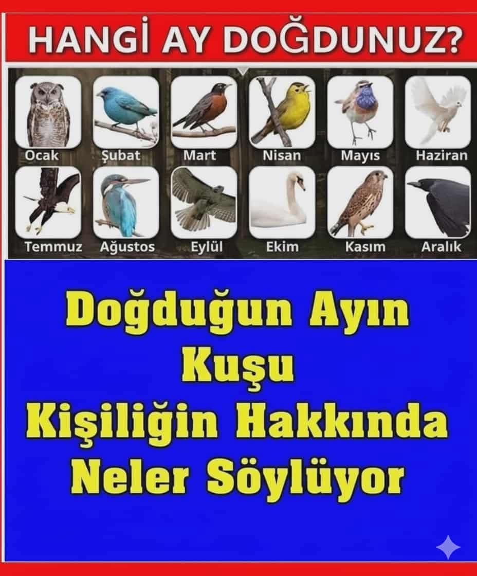 ARALIK Senin doğum kuşun “kuzgun” Sen dengeli, adil ve açık görüşlü bir insansın. Çalışkan ve disiplinli yapın ile başaramayacağın şey yok denecek kadar azdır. Geleceği ayrıntılı bir biçimde planlar, bu planın dışına kolay kolay çıkmazsın.İş hayatın aşk hayatından önce gelir fakat sevdiğin insana sonuna kadar sadık kalırsın. Şimdi sonucunu arkadaşlarınla paylaş!