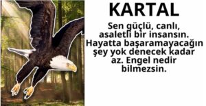 TEMMUZ Senin doğum kuşun “kartal” Sen güçlü, canlı, asaletli bir insansın. Hayatta başaramayacağın şey yok denecek kadar azdır, engel nedir bilmezsin. Kendine her zaman güvenirsin ve kendi doğrularını kolay kolay terk etmezsin. Tutarlı ve sakin kişiliğin ile etrafındaki insanlar için vazgeçilmez bir insansın. Doğalsın ve asla yapmacık hareketler sergilemezsin. Sevdiklerine karşı her zaman sadık ve hoşgörülüsün ve karşı taraftan da aynı şeyleri beklersin. Şimdi sonucunu arkadaşlarınla paylaş
