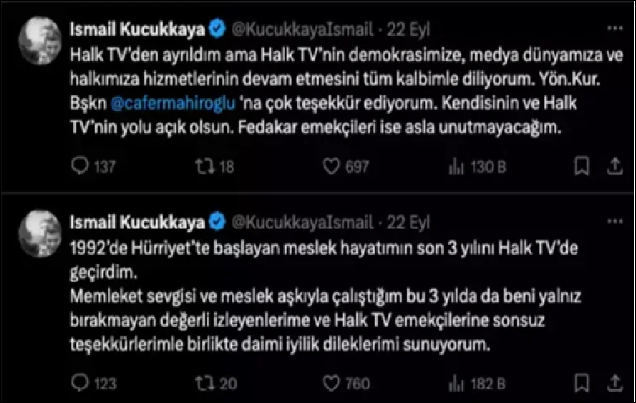 Halk TV'de Yeni Bir Sabah programını sunan gazeteci İsmail Küçükkaya kurum ile yollarını ayırdı. X hesabından açıklama yapan Küçükkaya, kanalın patronu Cafer Mahiroğlu'na teşekkür etti.