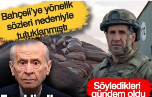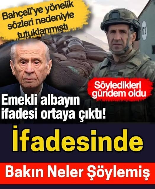 Bahçeli sözleri nedeniyle tutuklanmıştı: Emekli albayın ifadesi ortaya çıktı MHP lideri Devlet Bahçeli’ye yönelik sözleri sebebiyle tutuklanan Emekli Albay Orkun Özeller’in ifadesi ortaya çıktı. Emekli Albay Orkun Özeller hakkında MHP Genel Başkanı Devlet Bahçeli’ye ilişkin paylaşımları nedeniyle “halkı kin ve düşmanlığa tahrik”, “hakaret” ve “kamu görevlisine hakaret” iddiasıyla gözaltı kararı verilmişti.İfadesi çok konuşuldu.İş’te ifadesi………Us-ttekı Re-sımden Diğer Sayfaya Geçiş Yaparak Haberin Devamını Okuyabilirsiniz..