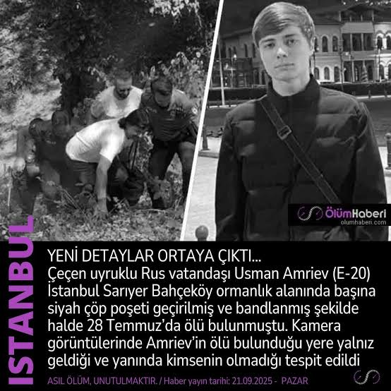 İstanbul Sarıyer’de 28 Temmuz sabahı ormanlık alanda hareketsiz halde bulunan 20 yaşındaki Rus vatandaşı Usman Amriev’in ölümüne ilişkin polis ve Adli Tıp Kurumu incelemeleri tamamlandı. Yapılan araştırmalar, Amriev’in ölü bulunduğu yere yalnız geldiğini ve yanında kimsenin olmadığını ortaya koydu.