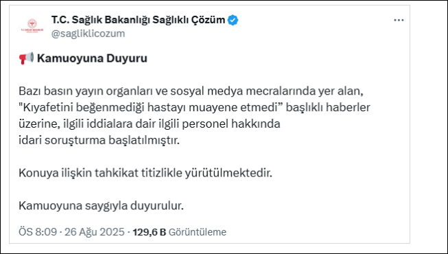 “Bazı basın yayın organları ve sosyal medya mecralarında yer alan, ‘Kıyafetini beğenmediği hastayı muayene etmedi’ başlıklı haberler üzerine, ilgili iddialara dair ilgili personel hakkında idari soruşturma başlatılmıştır. Konuya ilişkin tahkikat titizlikle yürütülmektedir.”