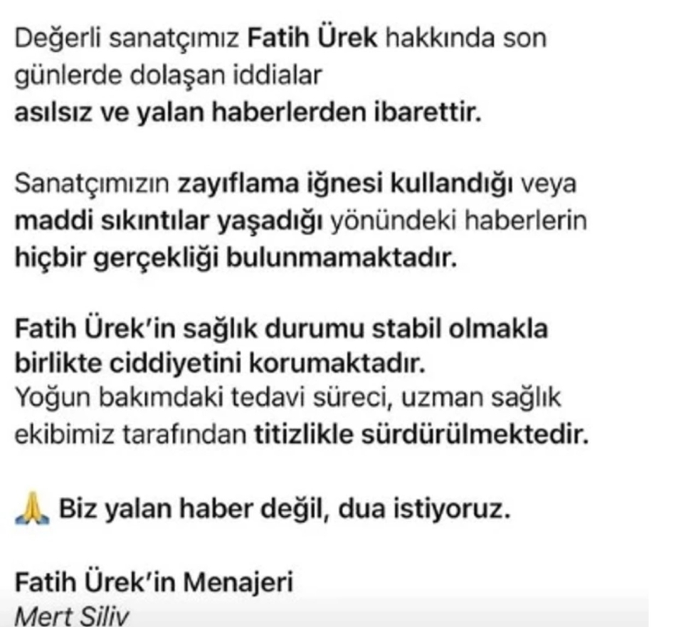 Evinde geçirdiği kalp krizi sonrası hastaneye kaldırılan ve yoğun bakımda tedavisi devam eden Fatih Ürek’in sağlık durumu hakkında yeni açıklama geldi.72 saat entübe olarak bekletilen Fatih Ürek’in bugün uyandırılması bekleniyordu. Fatih Ürek’in menajeri Mert Siliv, az önce maalesef diyerek açıklama yaptı… Türkiye yasta …Devamını okumak için diğer sayfaya gecebilirisniz..